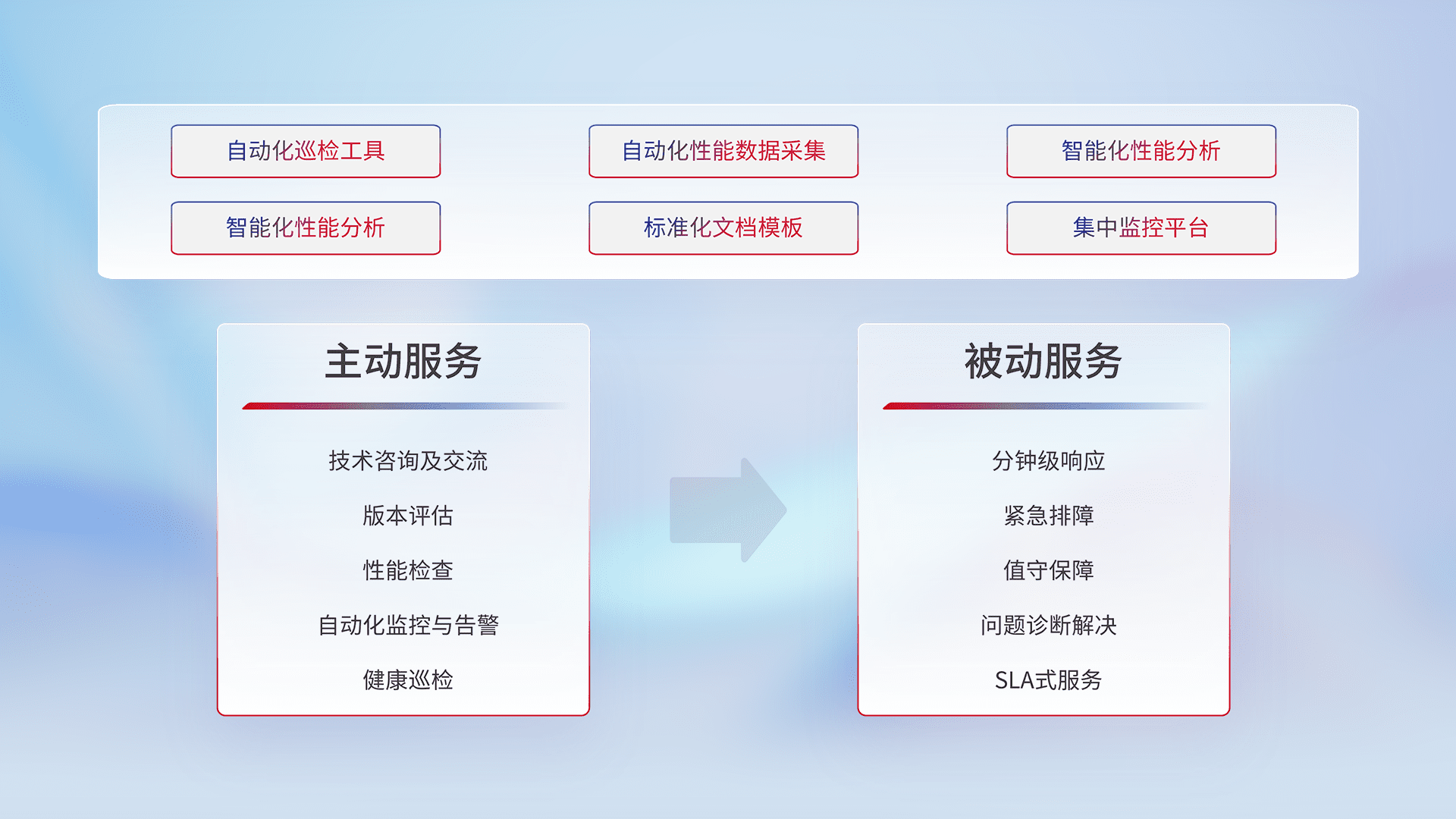 智能化工具和标准化文档,,保障服务质量,,提供主动服务(包含技术咨询、、、、版本评估、、、、性能检查、、、自动化监控与告警、、、、健康巡检)和被动服务包含(分钟级响应、、、紧急排障、、值守保障、、问题诊断解决、、、、SLA服务)。。